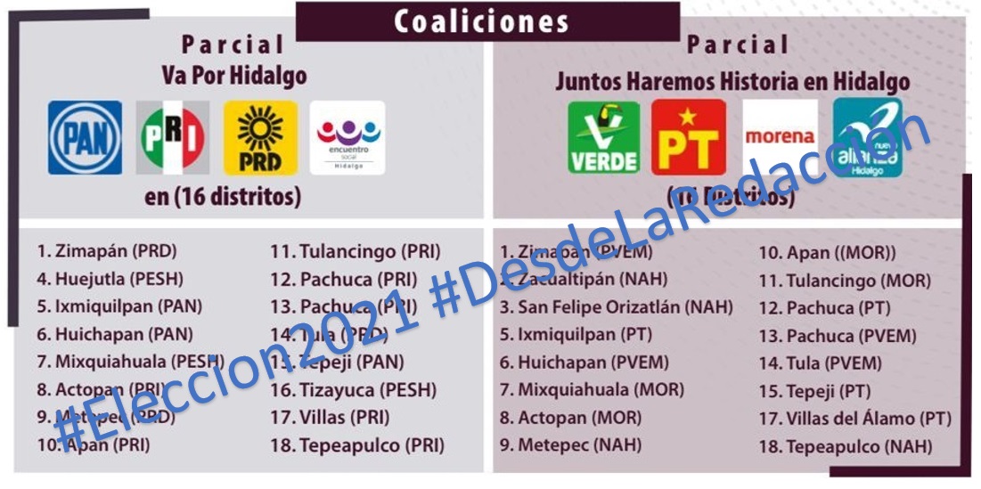 En la elección del 6 de junio en Hidalgo contendieron dos coaliciones: Va por Hidalgo integrada por PRI-PAN-PRD, y otra más llamada Juntos haremos historia constituida por Morena- PVEM-PT y PANALH; la primera contendió en 18 distritos, mientras que la segunda en 16