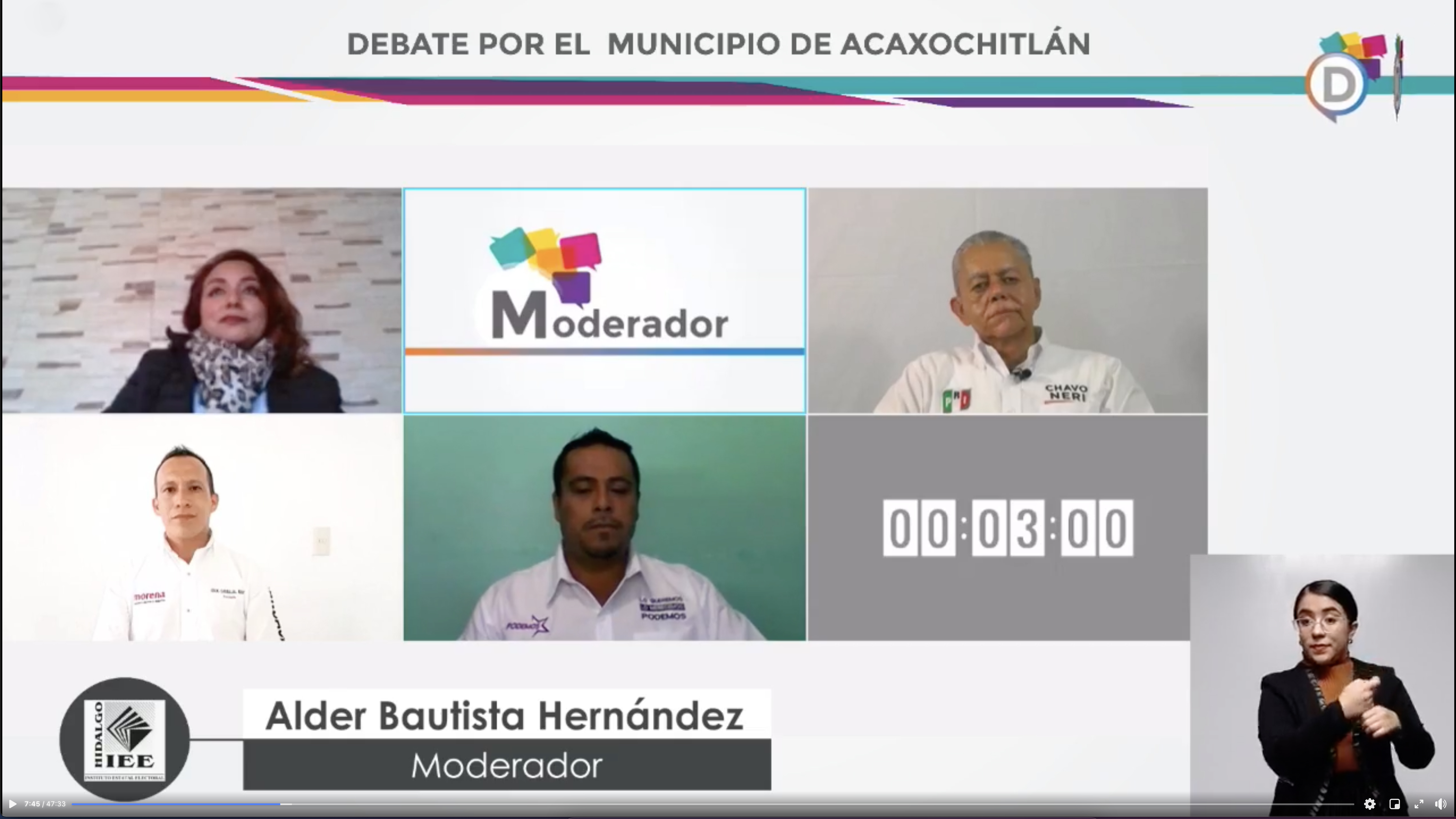 De manera exitosa concluyó el primer debate del Proceso Electoral Local Extraordinario por el municipio de Acaxochitlán organizado por el Instituto Estatal Electoral de Hidalgo (IEEH). En dicha actividad participaron la y los participantes a encabezar el Ayuntamiento, con la finalidad de dar a conocer a la ciudadanía las principales propuestas que forman parte de sus campañas proselitistas.