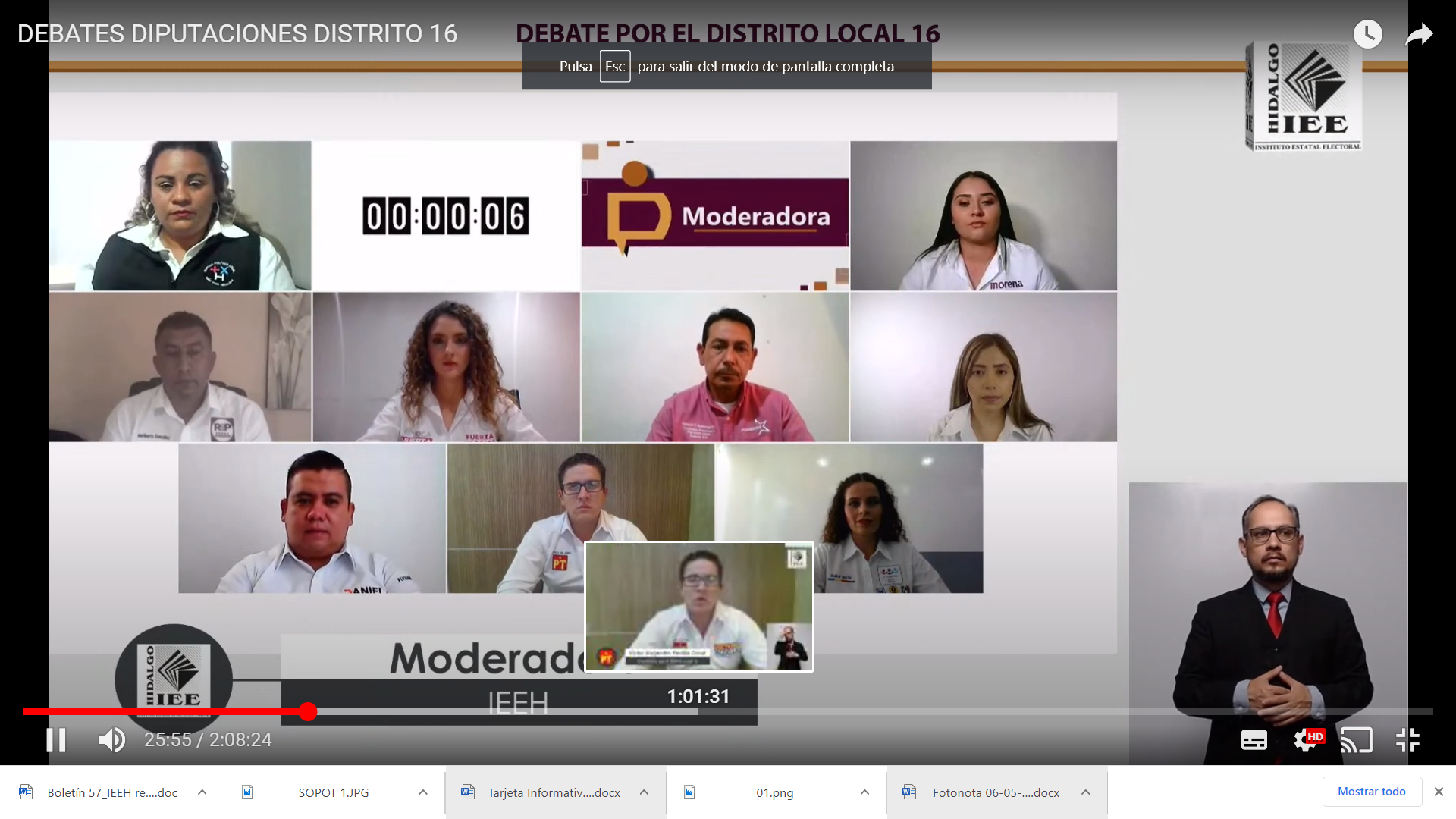 Fue realizado el sexto de los denominados #DebatesDiputaciones, organizados por el Instituto Estatal Electoral de Hidalgo (IEEH), en dicha actividad participaron las y los contendientes a una Diputación Local por el Distrito 16 Tizayuca, con la finalidad de dar a conocer a la ciudadanía las principales propuestas que forman parte de sus campañas proselitistas para obtener una curul en la LXV Legislatura.