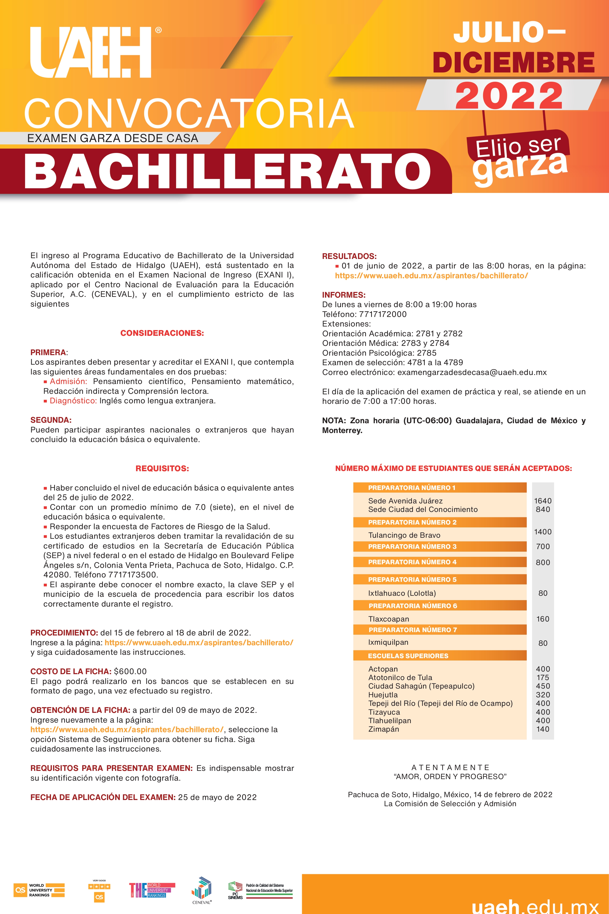El registro para Licenciatura y Bachillerato estará abierto hasta 18 de abril en la liga, https://www.uaeh.edu.mx/aspirantes/admisiones.html, donde quienes elijan ser Garza deberán seguir cuidadosamente las instrucciones. La prueba de admisión será desde casa y será aplicada por el Centro Nacional para la Evaluación de la Educación Superior (Ceneval).