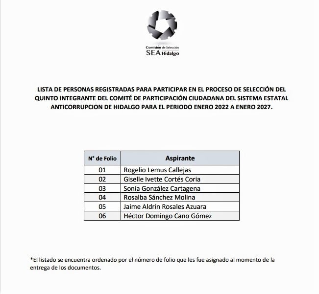 Con seis perfiles cerró el periodo de registro de aspirantes a ocupar la vacante como quinto integrante del Comité de Participación Ciudadana del Sistema Estatal Anticorrupción de Hidalgo para el periodo enero 2022 a enero 2027.