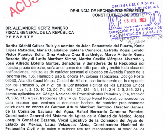 La senadora del Grupo Parlamentario del Partido Acción Nacional (GPPAN), Xóchitl Gálvez Ruiz, presentó a nombre diversos senadores una denuncia ante la Fiscalía General de la República (FGR) contra los responsables de la muerte de 14 pacientes del hospital del IMSS en Tula, Hidalgo, durante las inundaciones que se registraron el 6 y 7 de septiembre pasado.