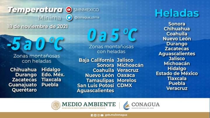 De acuerdo al análisis de las condiciones atmosféricas que la Subsecretaría de Protección Civil y Gestión de Riesgos estima con base en la información de la Coordinación Nacional de Protección Civil, se prevé el descenso de la sensación térmica en la entidad, por lo que, a partir de la madrugada de este viernes 19 de noviembre y al menos hasta el próximo lunes 22 de noviembre, se podrán registrar temperaturas de entre -5 a 0 °C.