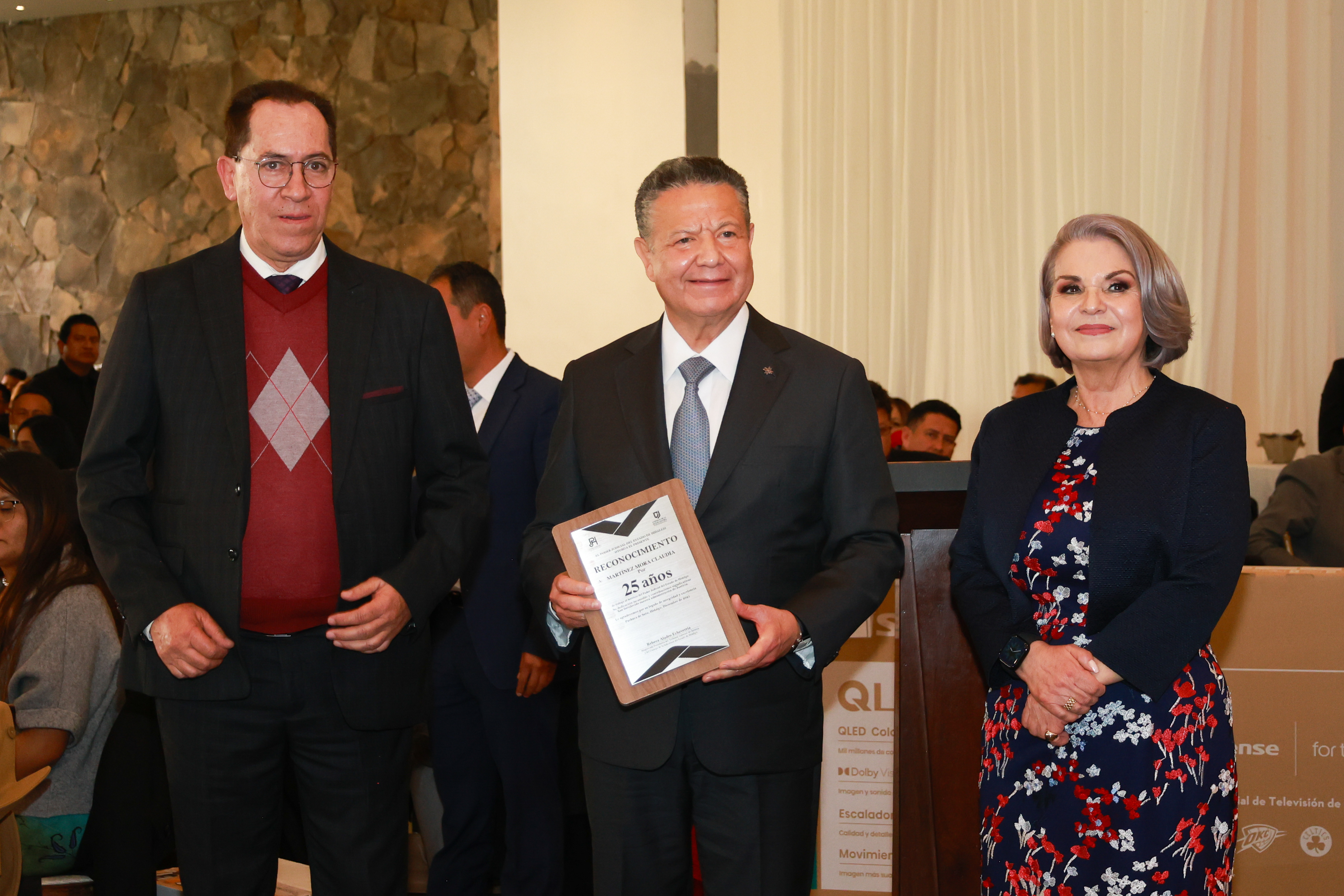 El gobernador Julio Menchaca Salazar acompañó a la presidenta del Tribunal Superior de Justicia del Estado de Hidalgo (TSJEH), Rebeca Stella Aladro Echeverría, a la entrega de reconocimientos por 25, 30 y 40 años de servicio a integrantes del Poder Judicial estatal, quienes con compromiso, esfuerzo y dedicación intervienen en la impartición de justicia en la entidad.