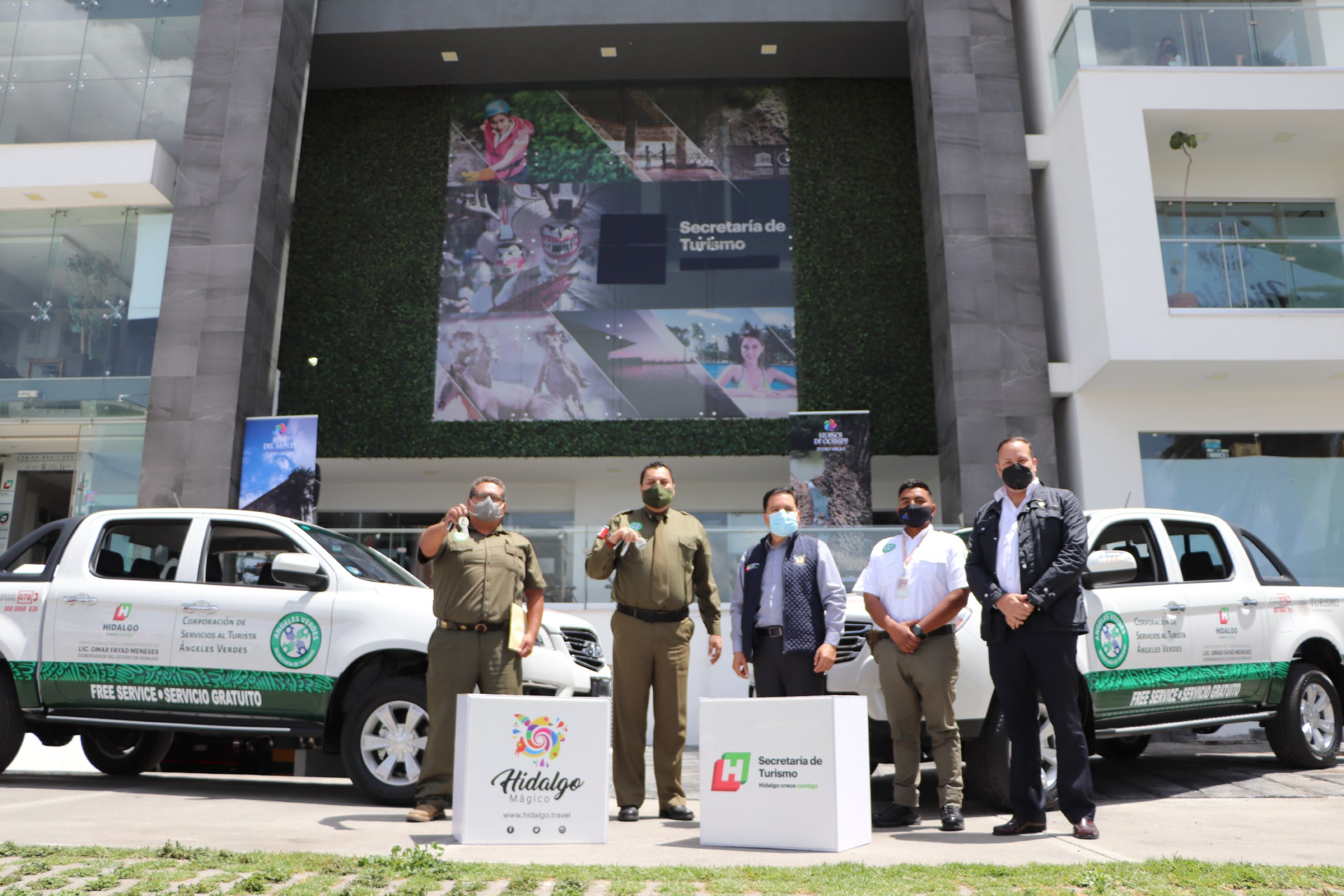 La tarde del jueves se efectuó la puesta en operación de unidades vehiculares donadas por el gobernador Omar Fayad para el servicio de la Corporación de Servicios al Turista Ángeles Verdes, en representación del titular del Ejecutivo el secretario de Turismo estatal, Eduardo Javier Baños Gómez, en compañía de Alejandro Zúñiga Bernal, titular de la Corporación Ángeles Verdes.