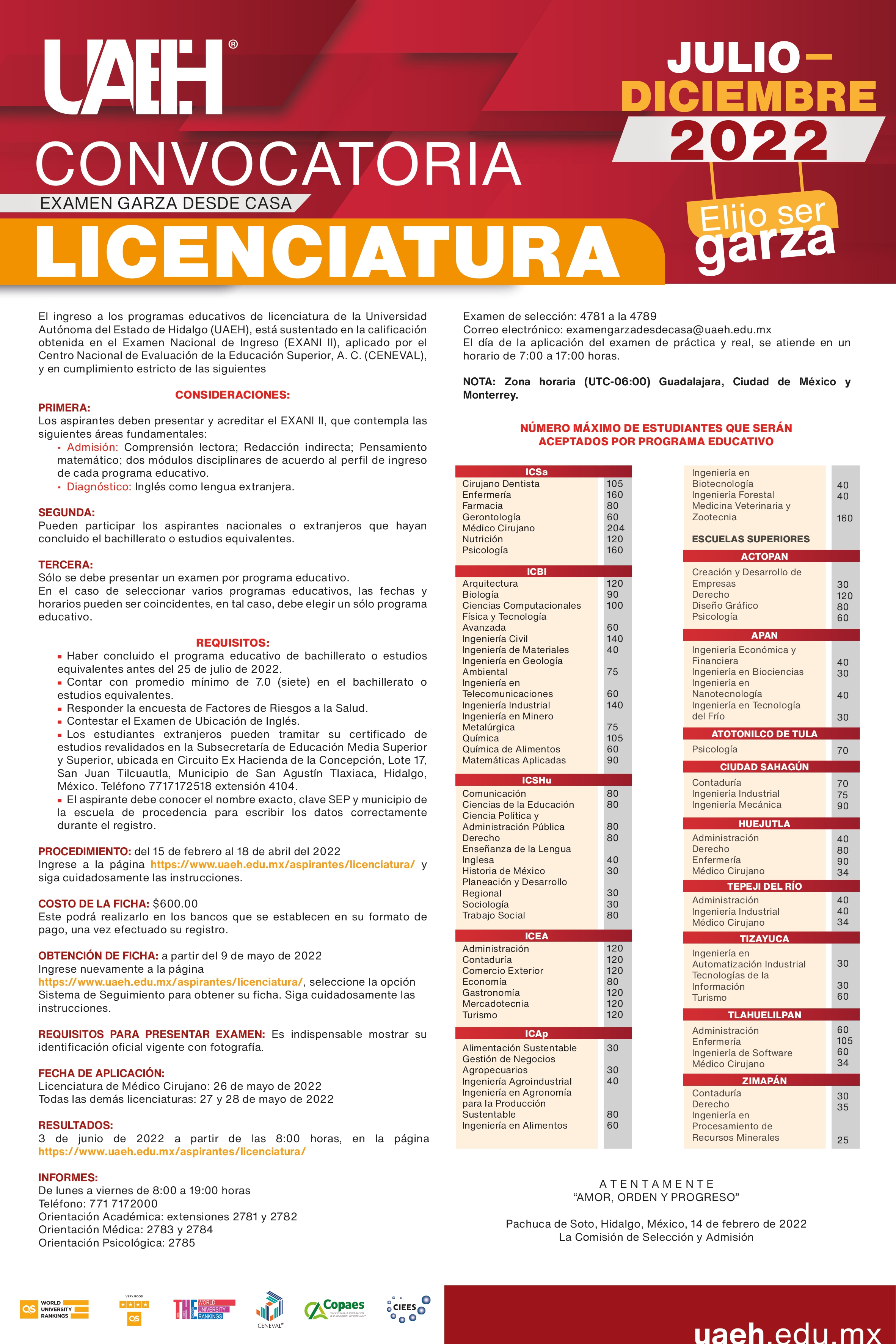 Para mayores informes, los postulantes podrán comunicarse de lunes a viernes en un horario de 8:00 a 19:00 horas al teléfono 771 7172000, a las extensiones 4781 y 4789, o bien, enviar un correo electrónico a Esta dirección de correo electrónico está siendo protegida contra los robots de spam. Necesita tener JavaScript habilitado para poder verlo..