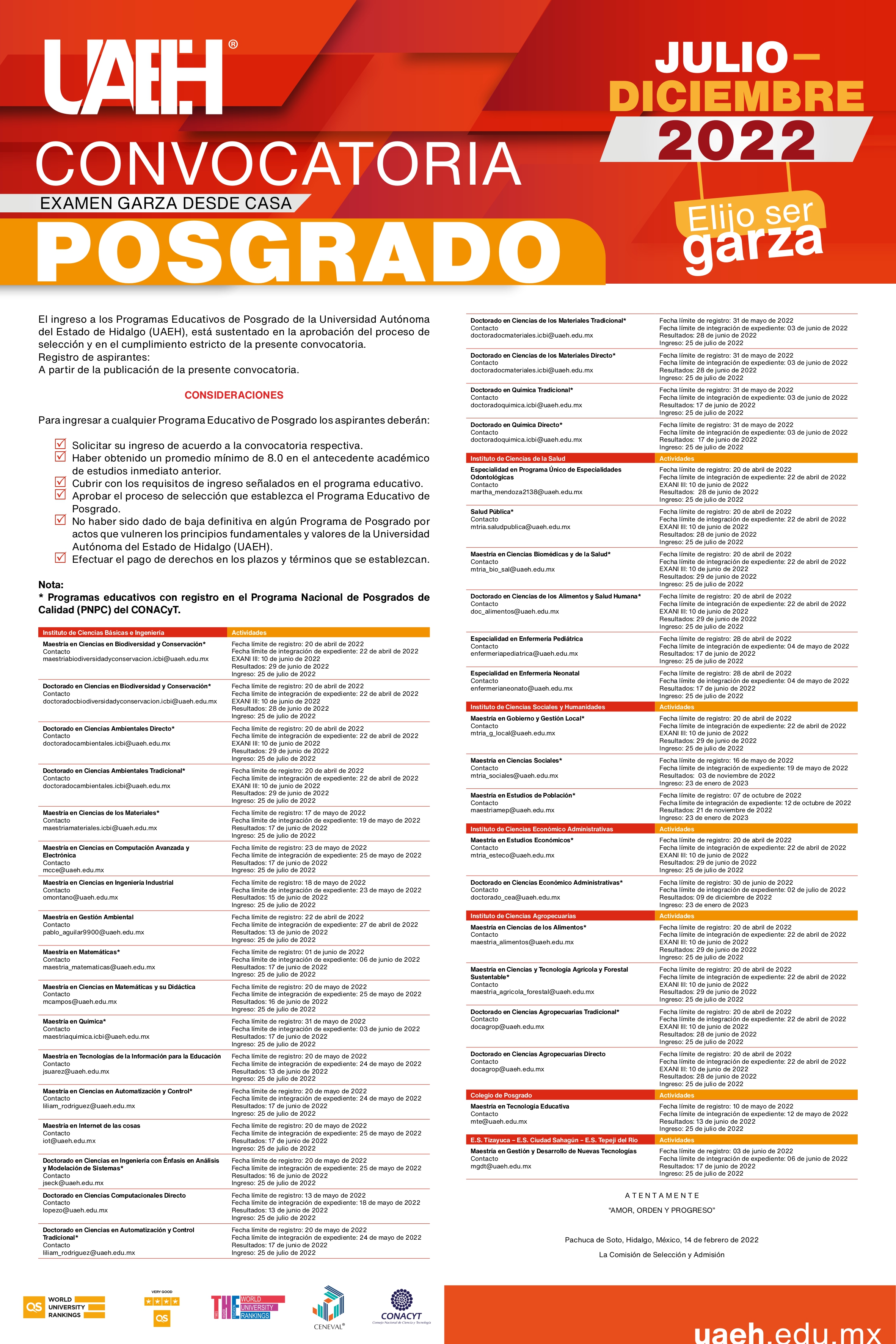 La Universidad Autónoma del Estado de Hidalgo (UAEH) publicó este día la convocatoria para ingresar a Bachillerato, Licenciatura y Posgrado durante el semestre Julio-Diciembre 2022, la cual se puede consultar en la página web institucional.