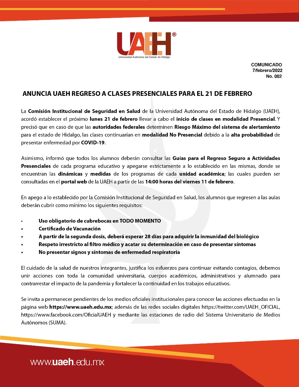 Tras las protestas de estudiantes, la UAEH anunció que será el 21 de febrero en que regresen a clases presenciales.