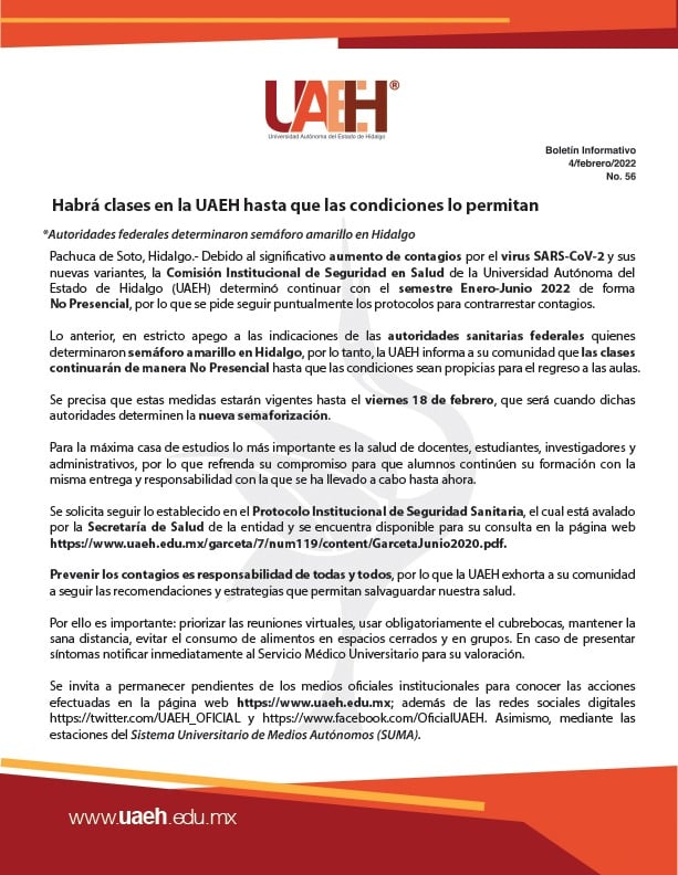 La UAEH informó que pospuso el regreso a clases presenciales de alumnos que estaba programado para el 7 de febrero.