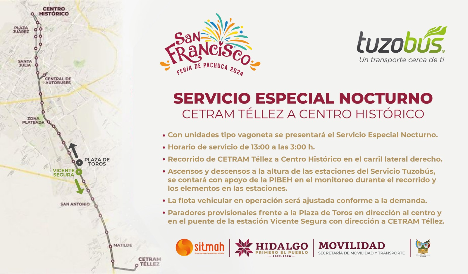 Con el objetivo de garantizar una movilidad segura y un servicio de transporte accesible para las y los asistentes al recinto de la Feria San Francisco Pachuca Hidalgo 2024, la Secretaría de Movilidad y Transporte (Semot) informa que, a través de sus dos organismos sectorizados, el Sistema Integrado de Transporte Masivo de Hidalgo (SITMAH) y el Sistema de Transporte Convencional de Hidalgo (STCH), realizará un operativo especial.