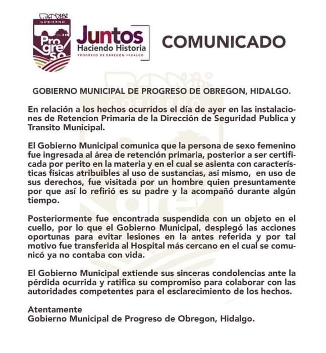El ayuntamiento de Progreso de Obregón a cargo del alcalde Armando Mera Olguín emitió un comunicado en el que narró todos los detalles de la muerte de la doctora Beatriz.