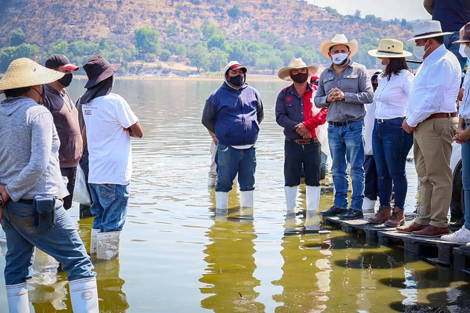 Con apoyo de la SEDRAGROH se siembran 100 mil crías de mojarra en la presa Requena en beneficio de los acuicultores.
